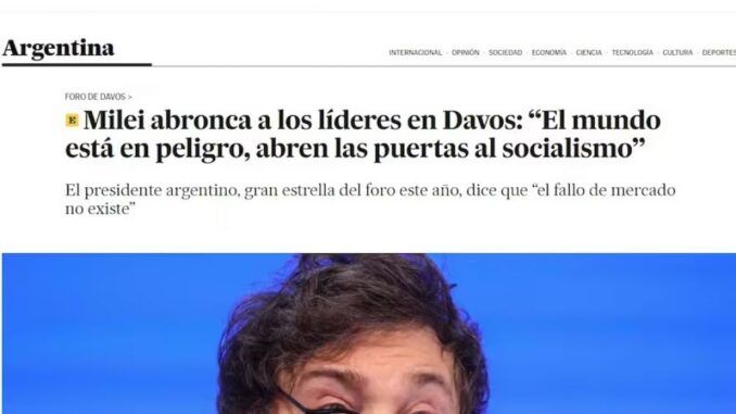“‘Occidente está en peligro’: el presidente argentino Milei -autodefinido un ‘anarco-capitalista’- instó a la elite de Davos de rechazar el socialismo”, tituló el medio estadounidense CNBC, en tanto.