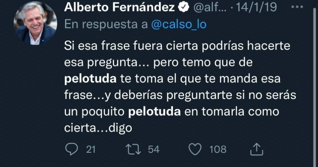El mismo año que fue electo, arremetió contra una mujer que lo criticó. Alberto Fernández dejó de lado el feminismo que hoy lo tiene como abanderado y respondió: «Si esa frase fuera cierta, podrías hacerte esa pregunta… pero temo que de pelo***a te toma el que te mandó esa frase. Y pregunto si no serás un poquito pelo***a en tomártela como cierta… digo«, arremetió.