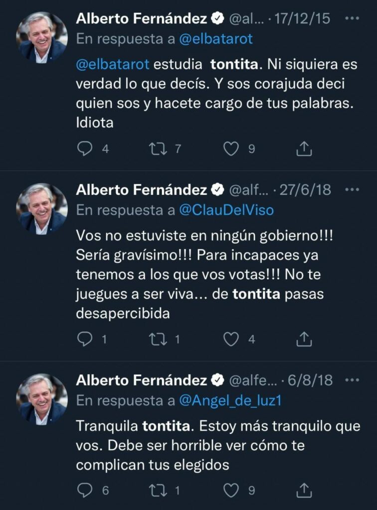 Uno de los cruces más fuertes y descalificadores que tuvo fue en 2017, dos años antes de asumir con Jefe de Estado. «Nena, no es algo que me inquiete lo que vos creas. Mejor aprendé a cocinar. Tal vez así logres hacer algo bien. Pensar no es tu fuerte. Está visto», respondió. Otro de los tuits que le recordaron fue cuando acusó a una usuario de «imbécil» y la trató de «nena«.