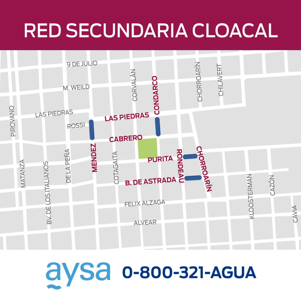 En relación a las obras de AySA, que se trata de trabajos en la red cloacal, se verán afectados tramos del Boulevard de los Italianos, Blanco Encalada, Bolaños y Bouchard, en Monte Chingolo. También se verán afectadas las calles Méndez, Condarco, Purita, Casares, Viamonte, Tejedor, Magallanes y Mendoza.