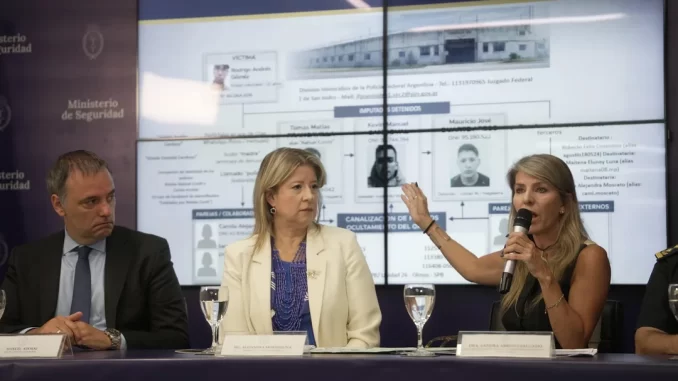 Acompañada por el jefe de Gabinete, Manuel Adorni, y la jueza federal Sandra Arroyo Salgado, Monteoliva sostuvo que los implicados se contactaron con la víctima a través de una app de citas con un perfil falso denominado “Julieta Ayelén Cardozo”.