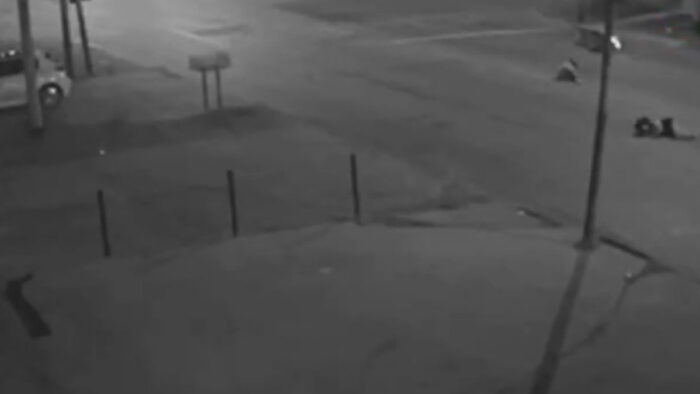 Las imágenes de la cámara de seguridad captaron el choque: el vehículo, que circula sobre la mano derecha de la avenida, dobla hacia la izquierda y embiste una moto. Sus ocupantes quedaron tirados en el piso y el conductor del auto se dio a la fuga.