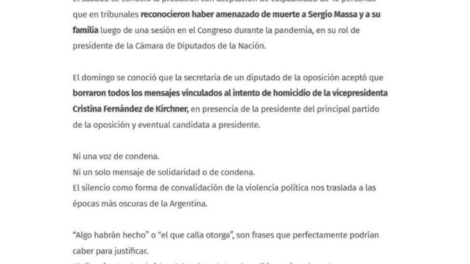 El silencio como forma de convalidación de la violencia política nos traslada a las épocas más oscuras de la Argentina.