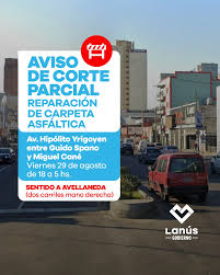 El Municipio de Lanús avisa que habrá un corte de tránsito en la Avenida Hipólito Yrigoyen para realizar tareas de reparación en la carpeta asfáltica.