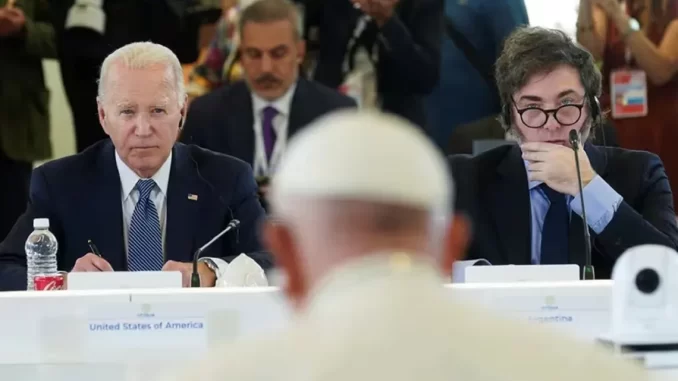 Minutos más tarde, se topó con Francisco en el Salón Plenario del G7, otro de los invitados de la italiana más allá de los líderes de los siete países que forman parte de la alianza internacional y quien viene de mantener un encuentro con el gobernador de la provincia de Buenos Aires y enemigo público de Milei, Axel Kicillof. De forma breve, el jefe de Estado saludó al Papa con un apretón de manos y un abrazo, escena que fue observada atentamente por Joe Biden, presidente de Estados Unidos.