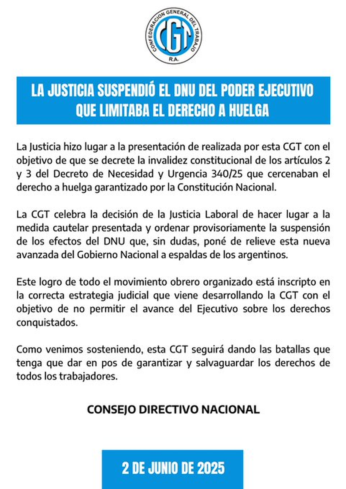El fallo, que suspendió los artículos 2 y 3 del DNU 340/25, fue celebrado por la central obrera, que destacó la «correcta estrategia» que viene siguiendo la central para «no permitir el avance del Ejecutivo sobre los derechos conquistados».
