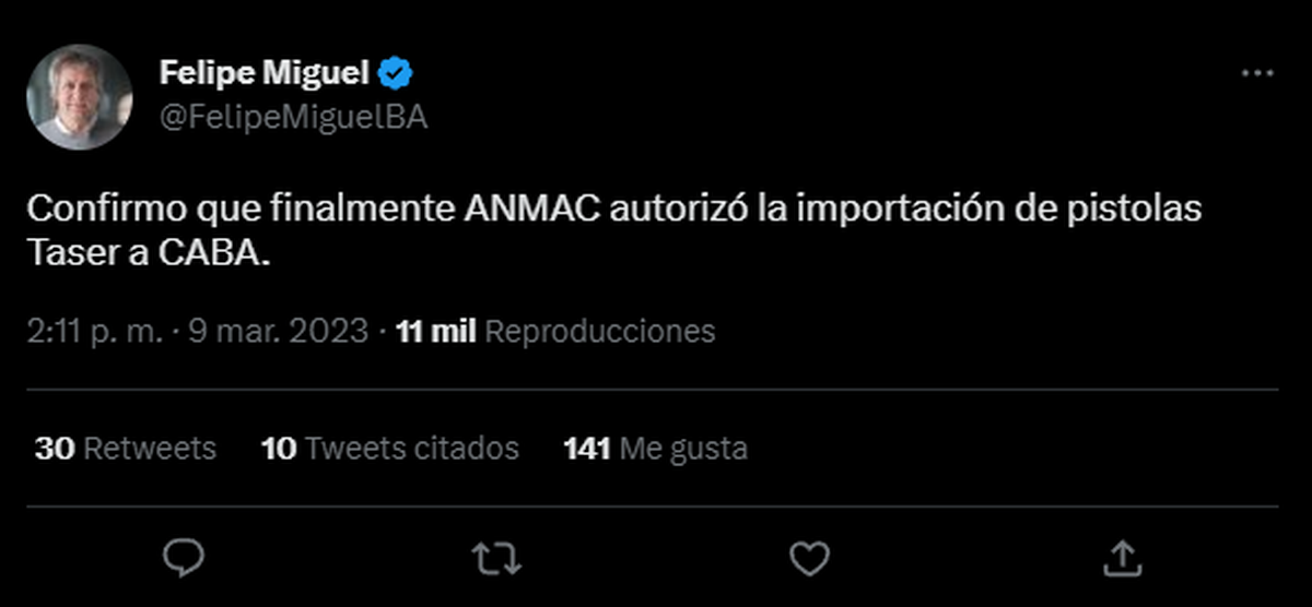 Así lo confirmó en Twitter por el jefe de Gabinete de Horacio Rodríguez Larreta, Felipe Miguel. “Confirmo que finalmente ANMAC autorizó la importación de pistolas Taser a CABA”, escribió en Twitter el funcionario porteño.