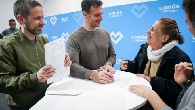 El intendente de Lanús, Julián Álvarez y el secretario de Gobierno, Leandro Decuzzi, encabezaron el acto de firma de convenios de prescripción administrativa que beneficiará 41 familias lanusenses.