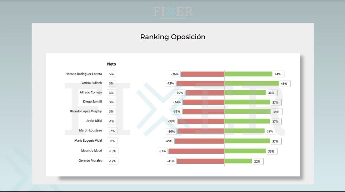 De acuerdo con Fixer, «en Juntos por el Cambio, la foto de marzo impacta de forma heterogénea. Mauricio Macri sube 1 punto la positiva (33%) y sube 3 la negativa (51%), es decir, se mantiene estable en su núcleo duro».