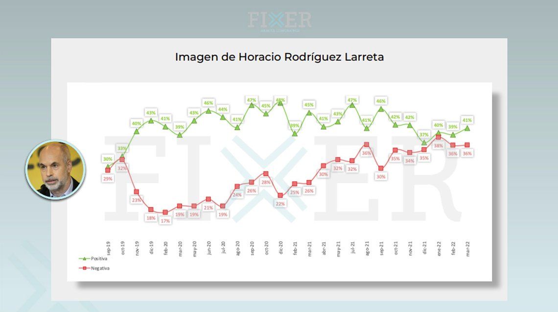 Por su parte, «el Jefe de Gobierno porteño, Horacio Rodríguez Larreta, mantiene la negativa en 36% y sube 2 puntos la positiva intramensual, alcanzando los 41 puntos. La mejora se explica en los segmentos terciarios completo (sube 9 puntos); en el segmento generación X (de 41 a 57 años), donde sube 4 puntos; y el votante del Frente de Todos, donde aumenta 3 puntos porcentuales»., indica la encuesta.