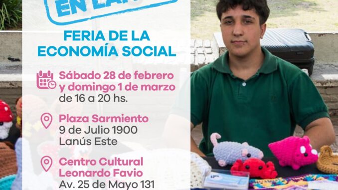 Lanús Gobierno realizará una nueva edición de la clásica Feria de la Economía Social “Hecho en Lanús” durante este sábado 28 de febrero y domingo 1 de marzo, de 16 a 20, en la plaza Sarmiento (9 de Julio N° 1900, Lanús Este) y en el Centro Cultural Leonardo Favio (avenida 25 de Mayo N° 131, Lanús Oeste).