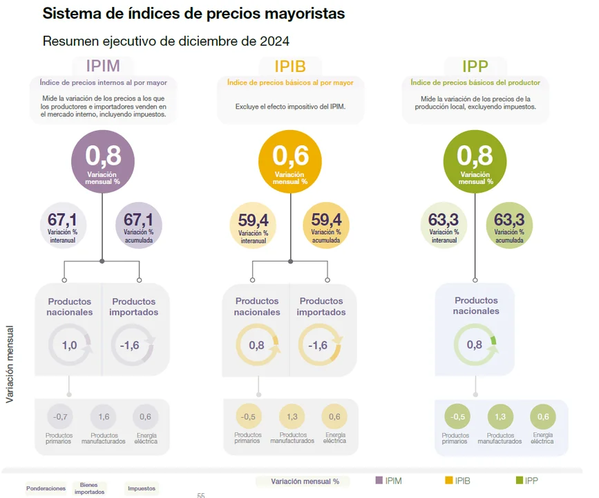 El nivel general del Índice de precios internos al por mayor (IPIM) registró un aumento de 0,8% en diciembre de 2023 respecto del mes anterior.