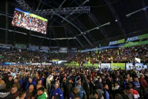 El precandidato presidencial de UP, Sergio Massa, recibió el apoyo a su candidatura de la Confederación General del Trabajo (CGT) en el Estadio Arena de Malvinas Argentinas