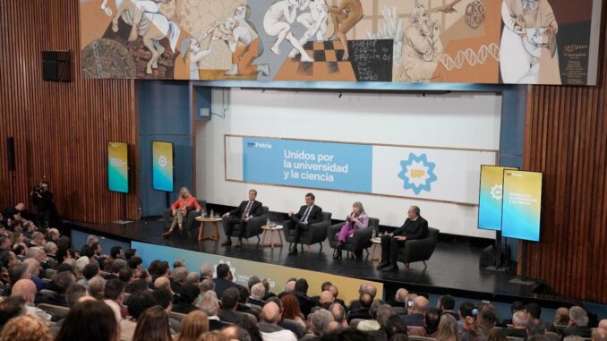 El Ministro de Economía, Sergio Massa, encabezó junto al presidente del Consejo Interuniversitario Nacional, Carlos Greco; la directora del Servicio Meteorológico Nacional, Celeste Saulo; el integrante del directorio de CONICET y del INVAP, Alberto Baruj; la rectora de la Universidad Nacional de Misiones, Alicia Bohren, el primer encuentro federal “Unidos por la Universidad y la Ciencia” que se llevó a cabo en el aula magna de la Facultad de Ciencias Exactas y Naturales de la Universidad de Buenos Aires (UBA), con la participación de rectores y miembros de la comunidad científica.