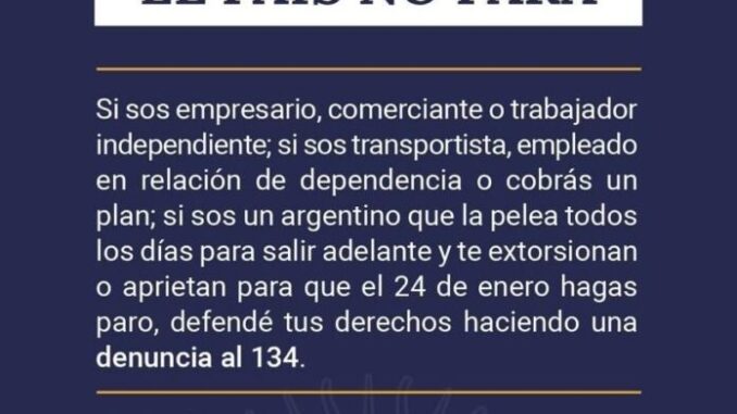 “Ante el conocimiento de la existencia de extorsiones, amenazas y aprietes a trabajadores y trabajadoras para que el 24 de enero se sumen al paro contra su voluntad, por el peligro de perder su puesto o el plan que cobran, el Ministerio de Seguridad de la Nación encabezado por Patricia Bullrich habilitó el 134 para recibir denuncias”, informó la cartera de Seguridad a través de un comunicado.