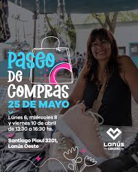 Lanús Gobierno informa que el lunes 6, miércoles 8 y viernes 10 de abril, de 13:30 a 16:30, se realizará una nueva edición del Paseo de Compras 25 de Mayo ubicado en Santiago Plaul N° 3201, en Lanús Oeste.