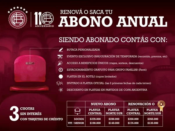 Si aún no tenes tu abono anual, podes adquirirlo y disfrutar de numerosos beneficios, como la posibilidad de personalizar tu butaca con nombre, apellido y número de socio, acceso prioritario a sorteos para viajes de Copa Sudamericana y entradas para partidos internacionales, entre otros. Además, los socios que abonen grupo familiar tendrán estacionamiento gratuito en cada partido de local.
