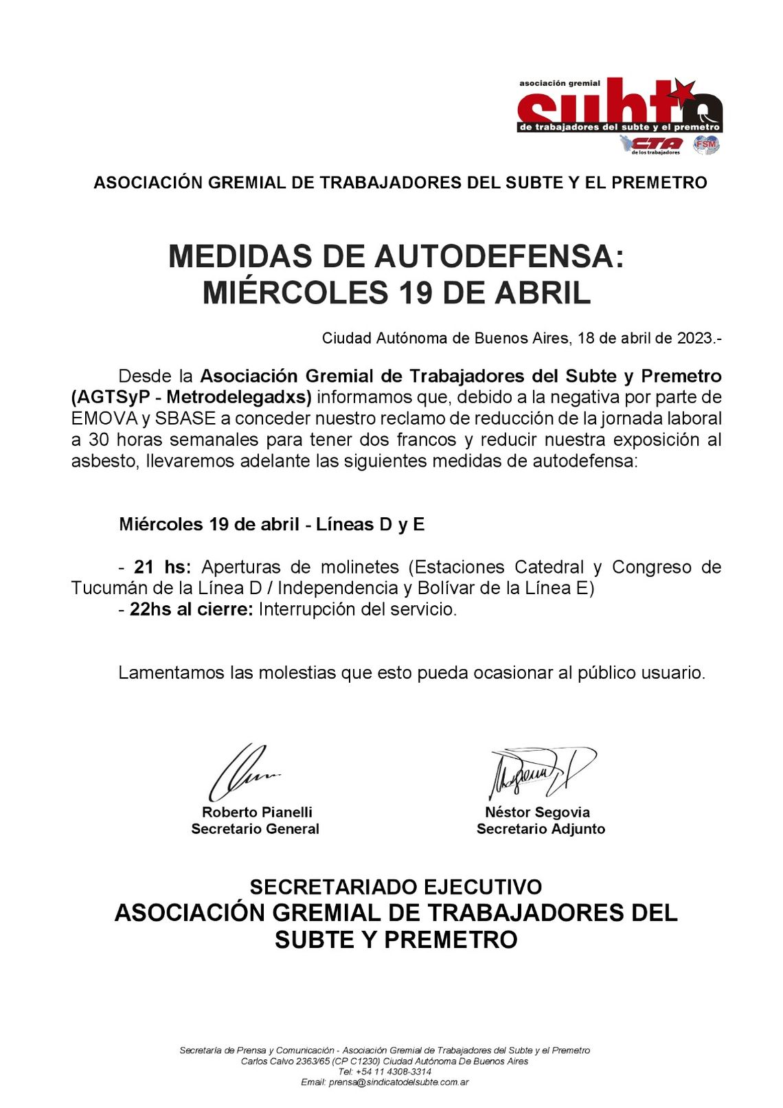 La Asociación Gremial de Trabajadores del Subterráneo y Premetro (AGTSyP) llevará mañana una nueva medida de fuerza, a partir de las 22 horas, en las líneas D y E del Subte, en reclamo de dos francos semanales para reducir la exposición al asbesto.