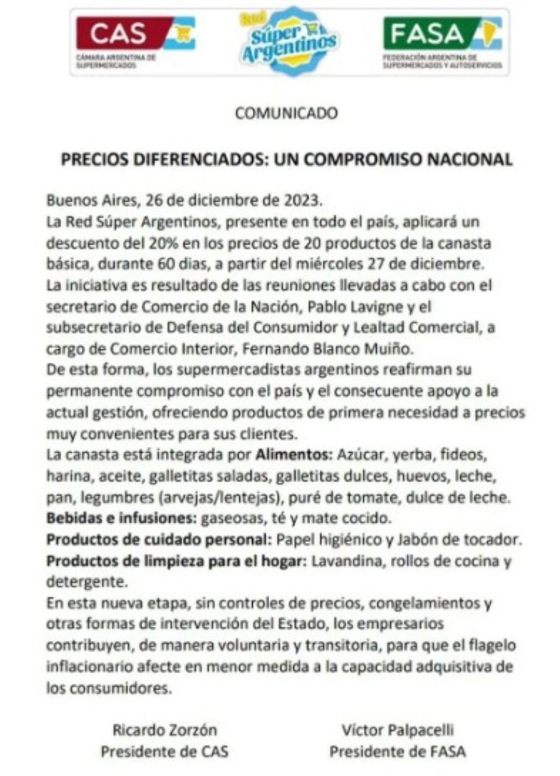 El grupo de supermercados asociados en “Red Super Argentinos” anunció que desde mañana aplicará un descuento del 20% en los precios de 20 productos de la canasta básica por 60 días.