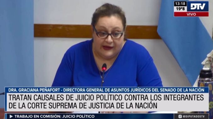 En primer lugar, expuso la directora General de Asuntos Jurídicos del Senado de la Nación, Graciana Peñafort, quien se refirió a su rol institucional: “Hay una vacante de la Cámara alta que no puede ser cubierta. El Senado aprobó la designación del senador nacional Martín Doñate (Frente de Todos) como representante de la última minoría que quedaba designar”. “Hoy el Consejo de la Magistratura funciona con 19 miembros y no con 20 como estaba ordenado”, afirmó.
